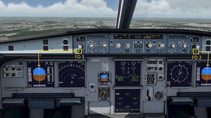 Superimposed on the attitude indicator of the primary flight display (PFD) we can see the flight director (F/D). The flight director can be turned on and off for either side by either pressing the F/D button or moving the F/D switch on the autopilot panel.