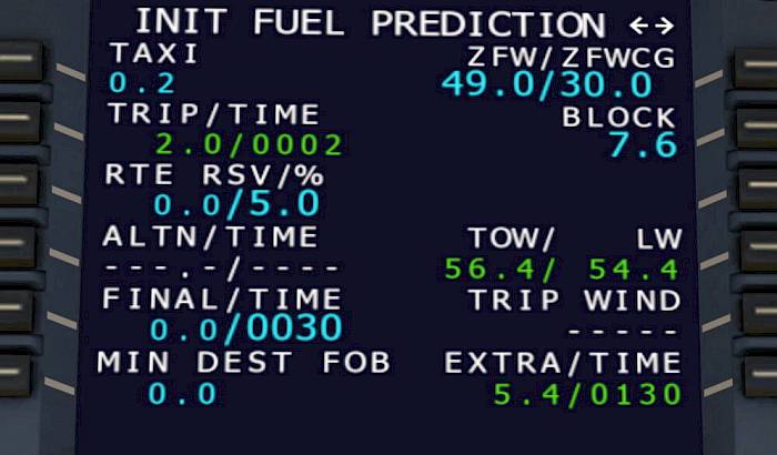 On the right hand side you can now see your expected takeoff mass (TOW) and landing mass (LW) in metric tons. In the lower right you can see the extra fuel and time, that is fuel and endurance that is remaining after you’ve flown to your destination and then to your alternate airport and performed a holding for 30 minutes.