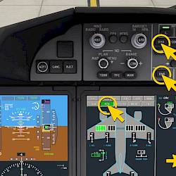 Using the CDU we can draw guidance lines onto the navigation display. These help us judge distances or inbound radials towards navigation fixes. We’re now adding the extended centerline for our departure runway and a 10NM range ring. You can also add multiple fixes using the next pages.