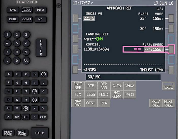 • The flap and speed pair can then be inserted into the FLAP SPEED field on the right so set the approach V-REF speed. You can also manually type in a valid flap setting and speed in knots, e.g. 30/150 and insert it into the field.