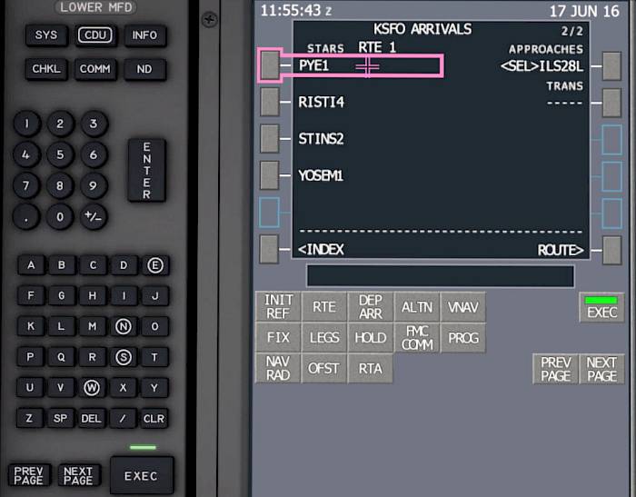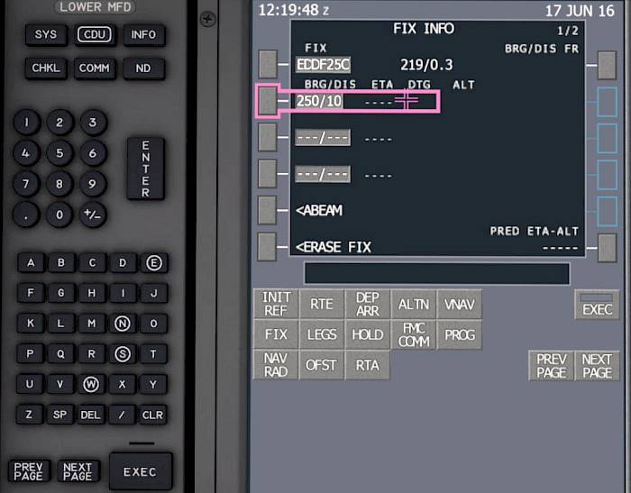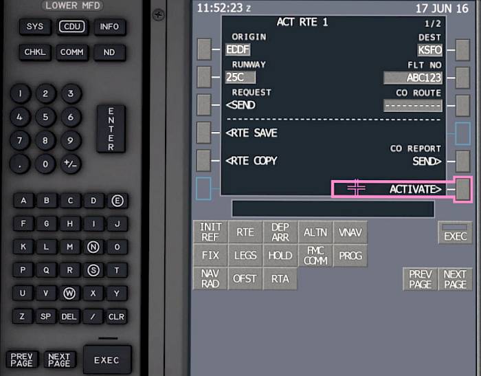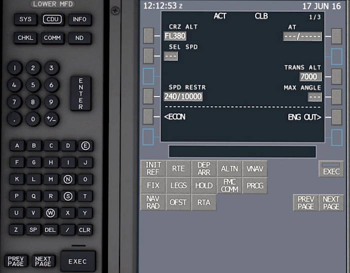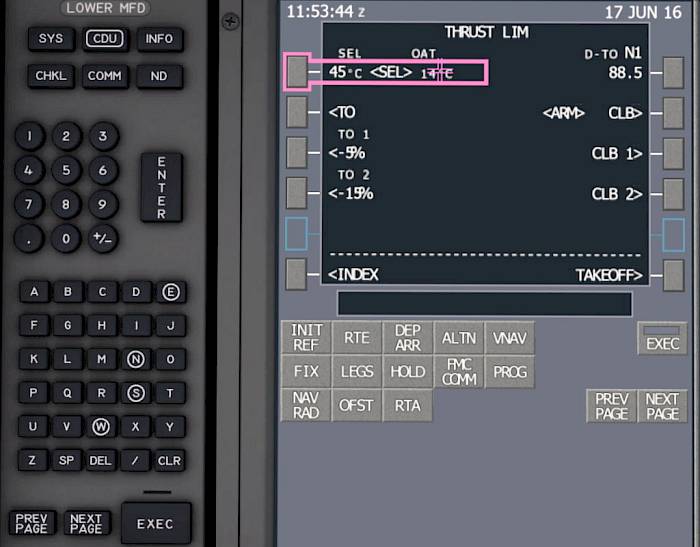 The CDU has many pages of which a lot are simulated. You can access the most relevant pages directly by clicking one of the page buttons under the CDU screen or screen area. Some sub-pages can then be accessed through clicking line select keys, e.g. then an arrow on the screen is pointing at the line select key.
