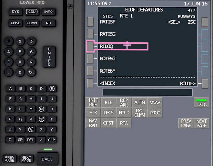 • If you already know what will be your departure runway you can insert it into the RUNWAY field on the left side, we’re using “25C”