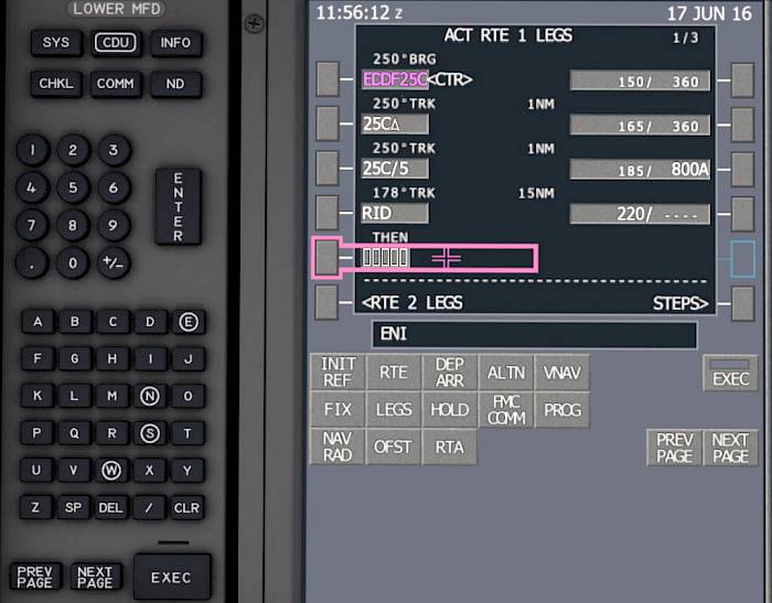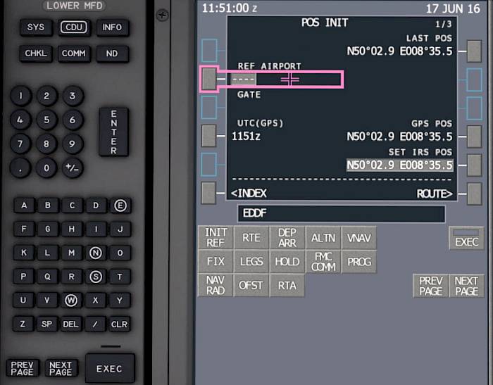 Data entry is accomplished by typing a value into the CDU scratchpad first. Then the value can be inserted into a field on the displayed CDU page with the line select key next to it. We’re now demonstrating the necessary steps to create a flight plan for the Flight Management Computer (FMC) using the CDU available in the Boeing 787 on the MFD screens. Per default those pages are selected on the lower MFDs.