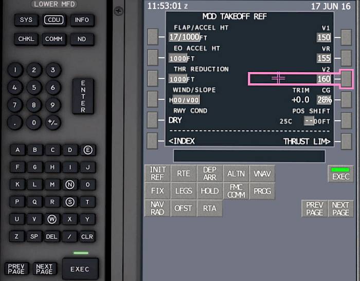 From the THRUST LIM page select the TAKEOFF option in the lower right. On this TAKEOFF REF page we can set the planned takeoff flaps, acceleration and thrust reduction height as well as enter our v-speeds.