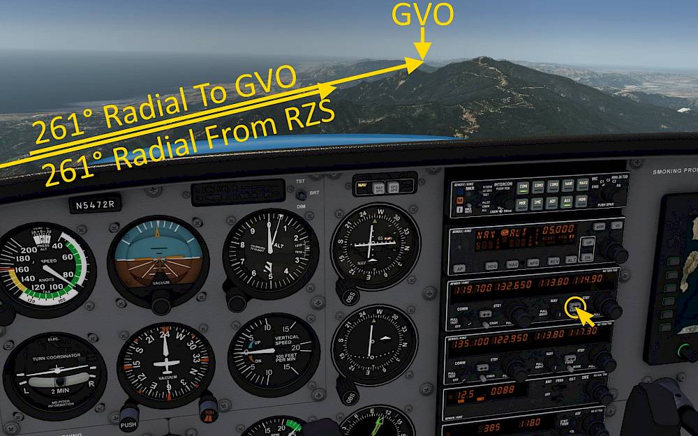 We’ll keep flying on this radial for a while. Before reaching GVO we’re starting our descent. Look at the DME display. When it’s showing about 3 NM to GVO we’ll initiate the descent.
