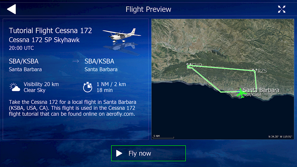 This route can be selected from the missions menu. Select the Cessna 172 in the aircraft menu, then go to the Missions menu, Aircraft list, select the C172 preview image and then locate the “Tutorial Flight Cessna 172” mission. When you see the mission preview select “Fly now” to set the navigation route automatically.