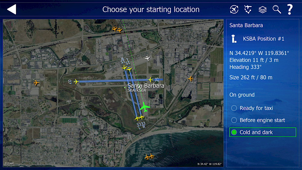 For our cold and dark tutorial we’re using the southern park position at Santa Barbara Muni (KSBA).