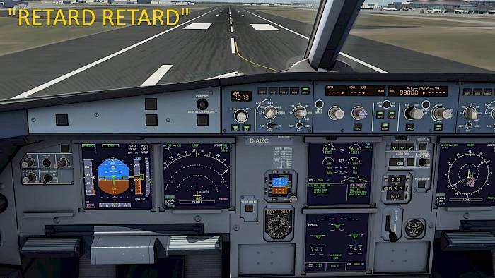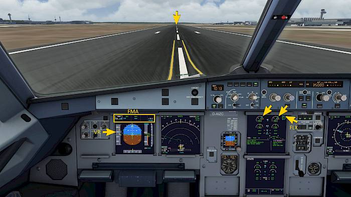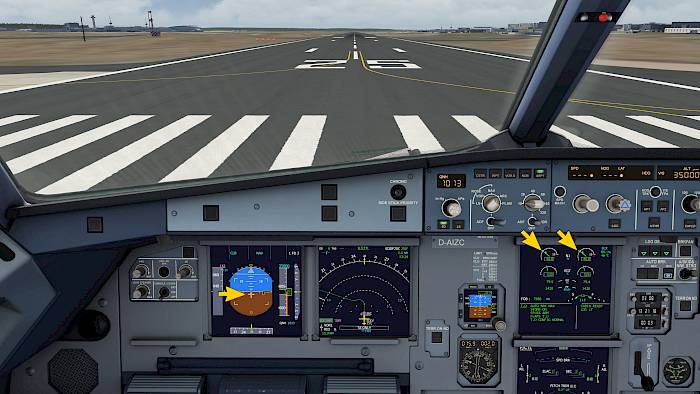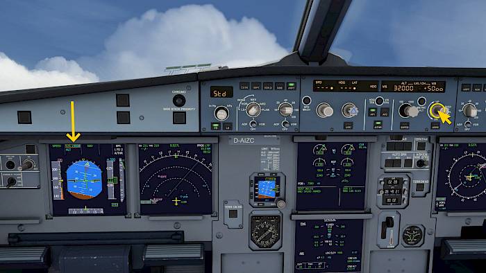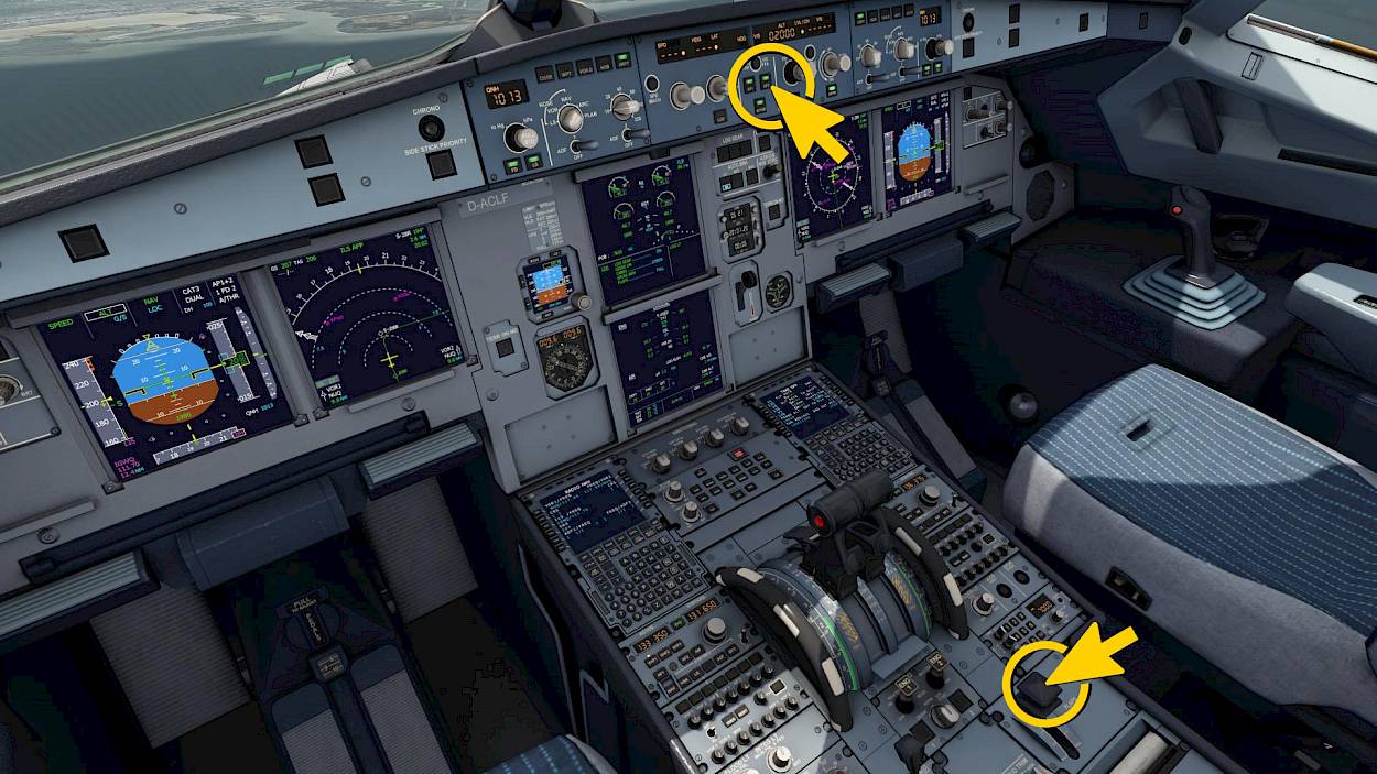 The autopilot flight control unit (FCU) should now show a dot and three dashes for the airspeed and heading and dashes for the vertical speed. If the speed or heading don’t show this you can normally push the knob to set the managed mode (*—).