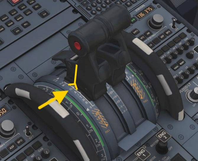 - Arm the ground spoilers by pulling the speed brake lever forward until the white stripe appears. You can also tap the lever briefly for this