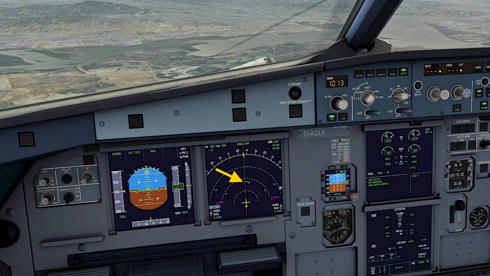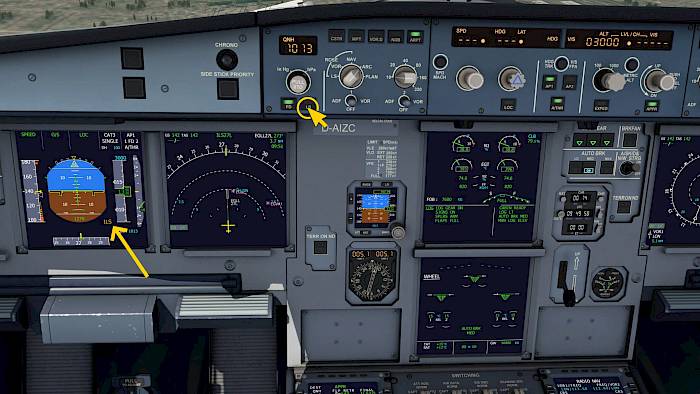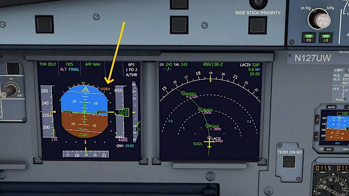 When no ILS approach has been selected then the ILS needles should not be displayed on the primary flight display. If the pilots have turned on the landing system display but no ILS approach is planned, then the primary flight display shows an amber V/DEV flashing in the top right corner of the attitude indicator.