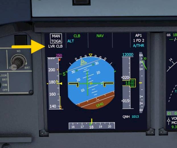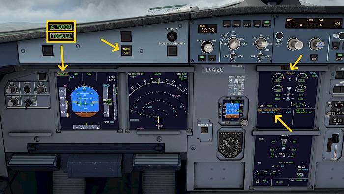 Notice that the active thrust mode on the flight mode annunciator (FMA) is now A.FLOOR or TOGA LK boxed in an amber color and flashing. On the engine display (upper ECAM) you can see an amber pulsating A.FLOOR or TOGA LK text.