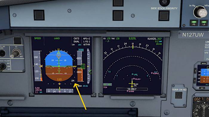 Approach markers are radio beacons with a limited range that are installed along the final approach course for a runway. The outer marker (OM), middle marker (MM) and inner marker (IM) are displayed in the lower right corner of the attitude indicator and blink or flash when the aircraft flies over it. This is an information for the pilot that they are approaching the runway.