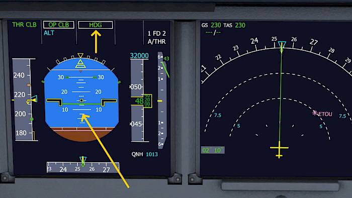 Note - If you have NAV or LOC mode engaged and CLB/DES or G/S active you can pull the heading knob and immediately after confirm the automatic change to OP CLB or V/S by pulling the respective buttons to prevent the attention getter and mode flashing.