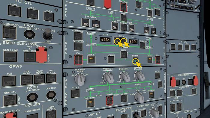 - Push BAT 1 and BAT 2 pushbuttons to turn both batteries on which will give us basic DC power