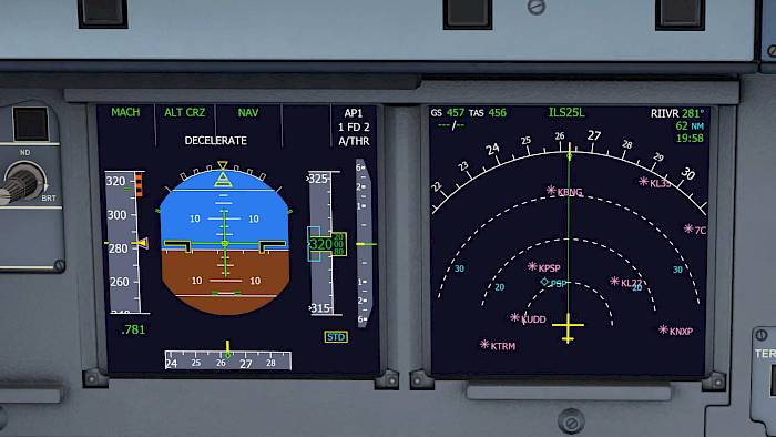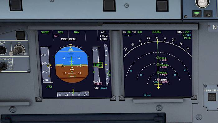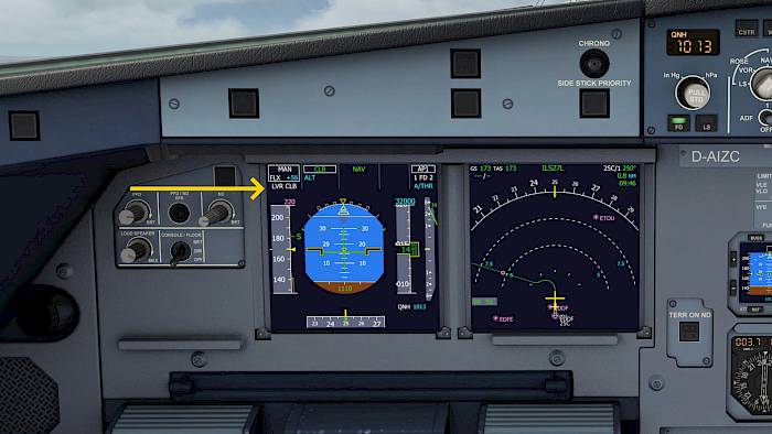 The primary flight display (PFD) shows the active and armed thrust, lateral and vertical modes on the flight mode annunciator (FMA) section at the top.