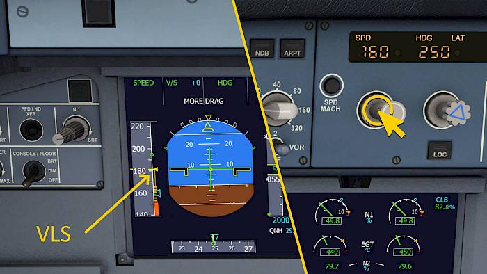 With the vertical speed mode (V/S) engaged the aircraft tries to pitch for the selected vertical speed target. This affects the airspeed and if climb thrust is not enough to stay above the stall speed or when even at idle thrust the aircraft still speeds up above the maximum allowed airspeed, then the vertical speed mode starts flashing in amber color on the FMA. The autopilot issues a triple clicking sound “Tick Tick Tick” and adjusts the vertical speed target to stay within the safe airspeed envelope.