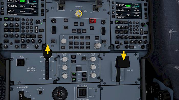 On the primary flight display (PFD) in the bottom memo area we can now observe the flaps moving to 1+F (position one with flaps) and we can also see a cyan triangle above the wing graphic to indicate that the ground spoilers have been armed.