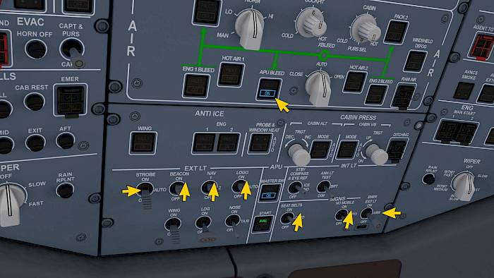 In preparation for the upcoming engine start let’s switch on external lights and passenger signs.