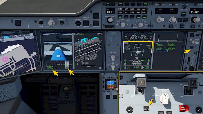 The checklist should now be all green, “no blue”. If a caution or warning has appeared you can clear it by clicking the CLEAR text on the screen or by pressing the CLR buttons on the ECAM control panel. Follow the instructions that the caution or warning gives you to prevent the warning from showing up again during takeoff.