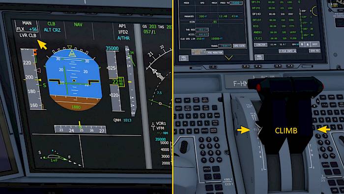 The autopilot keeps climbing to the altitude we’ve set in the autopilot panel (AFS CP) and if we have entered a route before departure it will automatically follow it at this time. Otherwise it will fly straight ahead until we rotate the selected heading knob and pull the knob to activate the selected heading mode.
