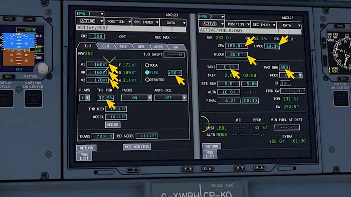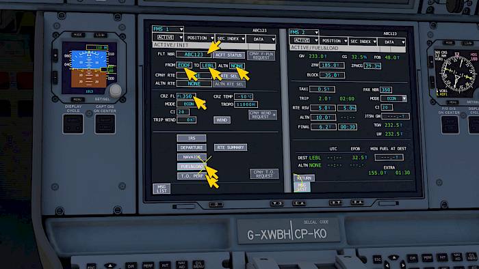 The aircraft needs a couple of parameters in the flight management system (FMS) to function correctly. We’re going to insert the bare minimum here, without any navigation route. If you already planned a route through the missions or through the navigation menu most data for the route is already inserted.
