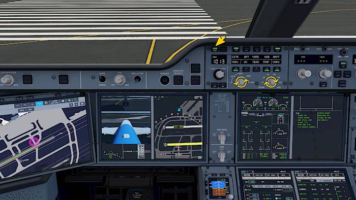 On the navigation display (ND) we can now see an airport map. You can drag the map with your mouse or finger touch gestures. In modes other than PLAN the view jumps back to the aircraft automatically after a few seconds.