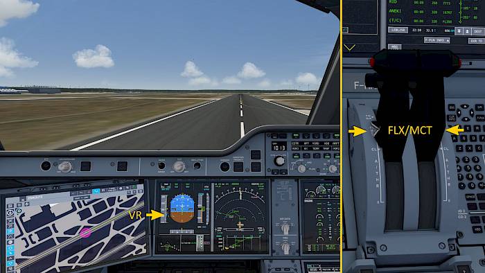 At around 1500ft above the runway we reach the thrust reduction height (THR RED) and acceleration height (ACCEL). On the primary flight display (PFD) a white LVR CLB text starts flashing, reminding us to set the thrust levers to climb thrust.