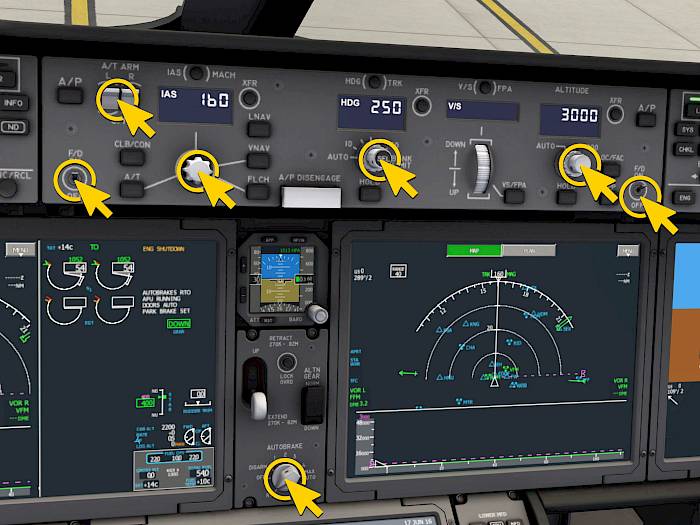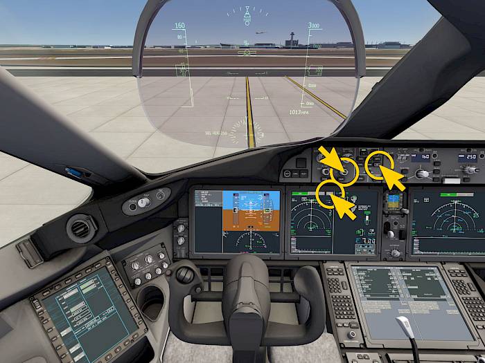 Now the aircraft displays are starting to show the first values like airspeed and altitude and after the IRS has aligned we can also see the aircraft position on the navigation displays.