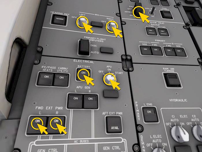 - If you see the forward external power left and right (FWD EXT PWR L, R) “AVAIL” lights then go ahead and push the two switches in to use the external power supply to ON.