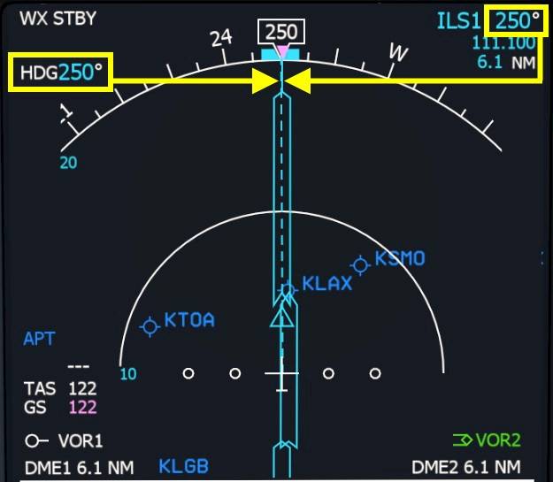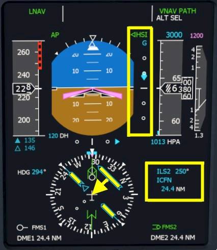 The HSI on the bottom center shows the localizer deflection. We’re heading to roughly 294° and the localizer and runway course are about 250°, so roughly a 45° intercept. As we come closer to the localizer the course deviation indicator will move towards the center as shown with the arrow.