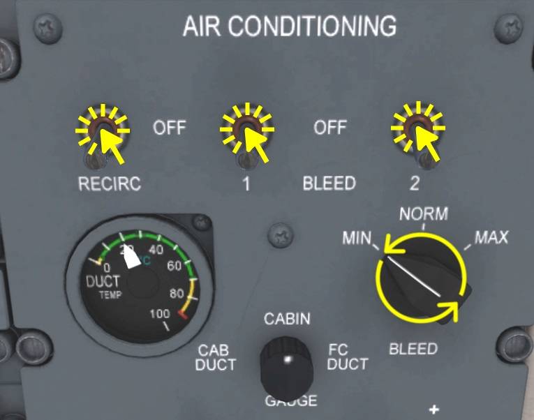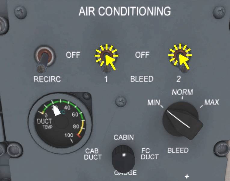 | 3 | Overhead | AIR CONDITIONING | BLEEDS | ON/MIN | |