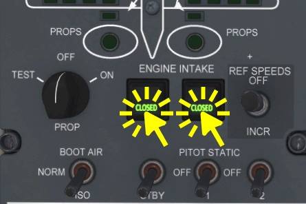 | 4 | Overhead | ICE PROTECTION | ENGINE INTAKE 1&2 | SET CLOSED | |