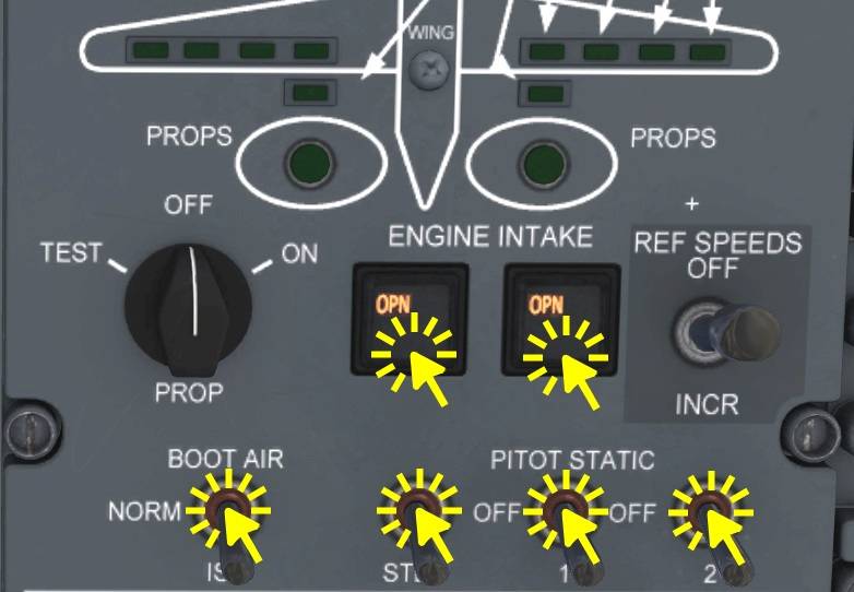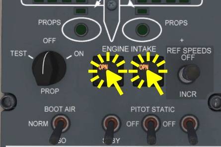 | 11 | Overhead | ICE PROTECTION | ENGINE INTAKE 1&2 | SET OPN | Press each button 1x |