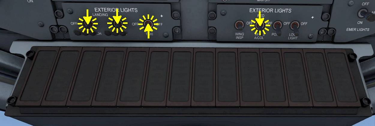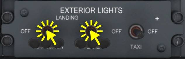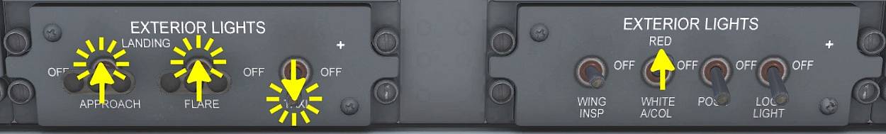 Do a quick look up to the EXTERNAL LIGHTS panel in the overhead and turn off the APPROACH and FLARE landing lights. Set taxi lights to ON.