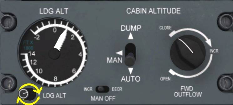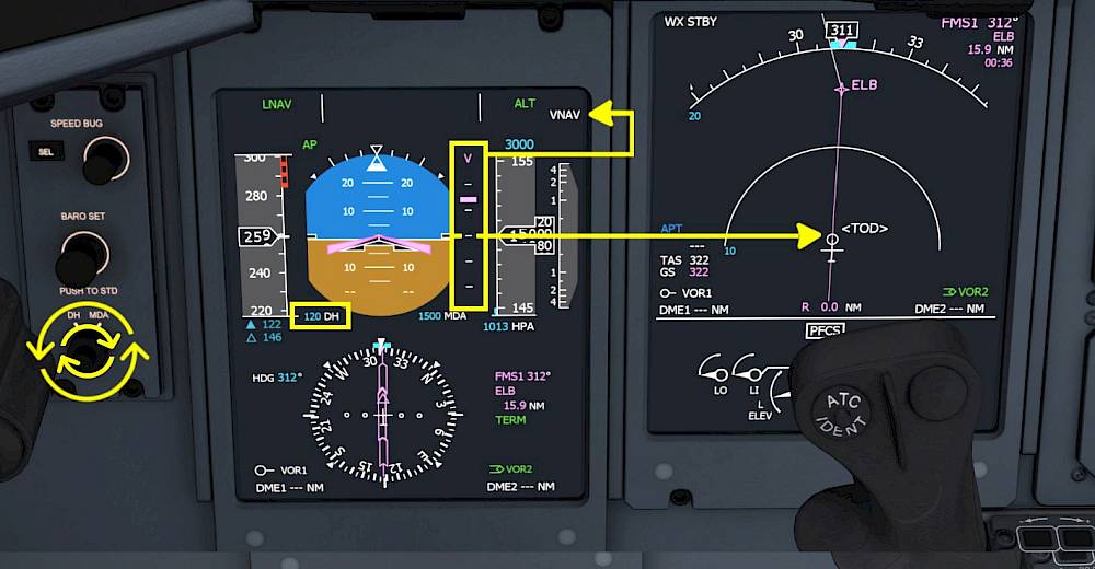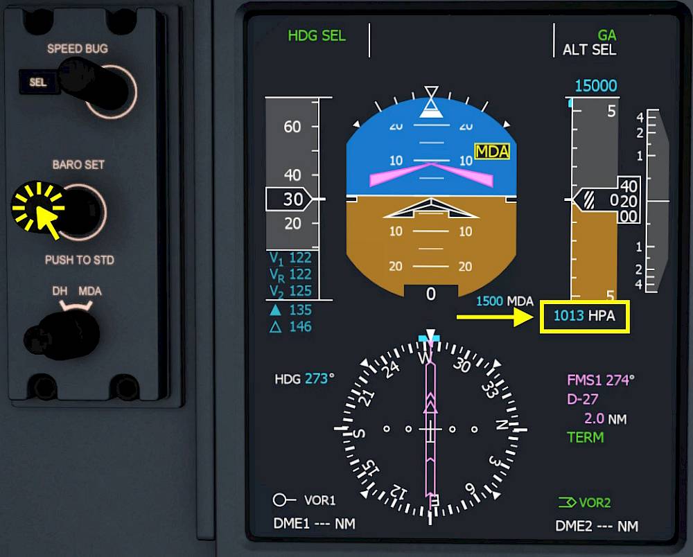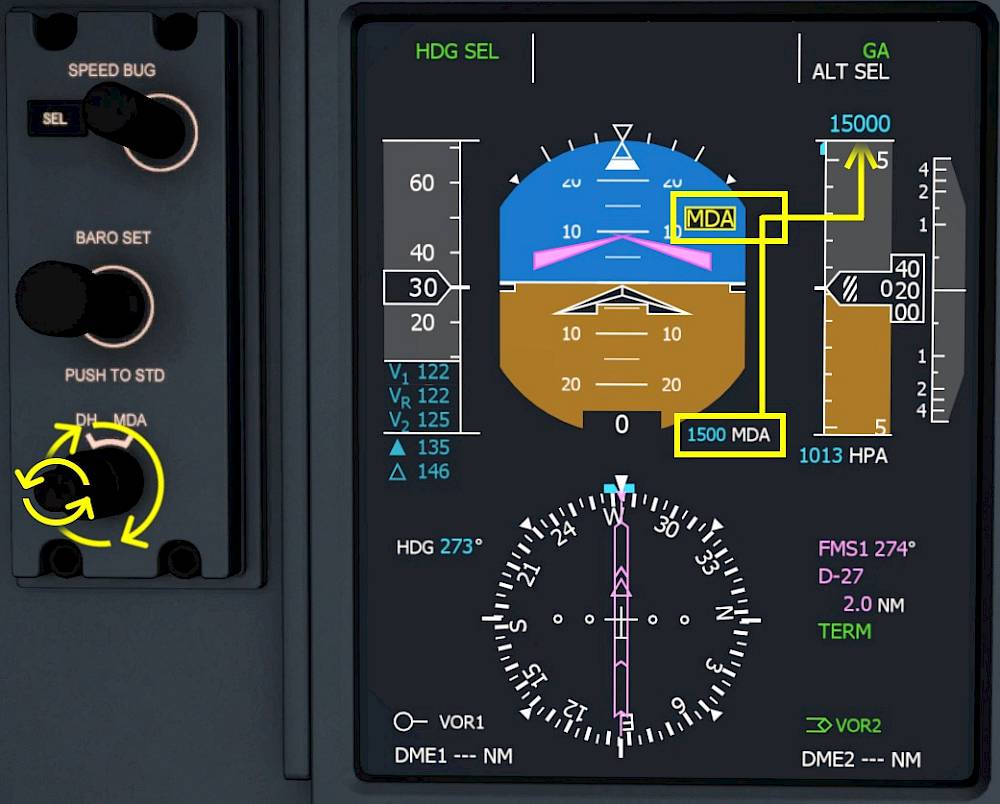 We’re going to set the MDA bug to 1500ft over the airfield elevation to know when to transition to the climb phase. The steps necessary for this have already been shown in the introduction to the flightdeck of the Q400, here they are again. For San Diego which is only barely above sea level we’re just going to use 1500ft for the MDA setting.