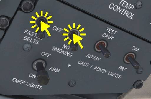 | 2 | Overhead | Signs | FASTEN BELTS | SET ON | No later than 10,000ft |