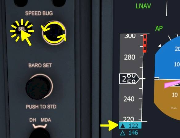 Maintain a speed of around 135 kts now. The final approach reference speed (V-REF), as mentioned and set as V-Speed before, is around 122kts in this configuration. Time to run the landing checklist.