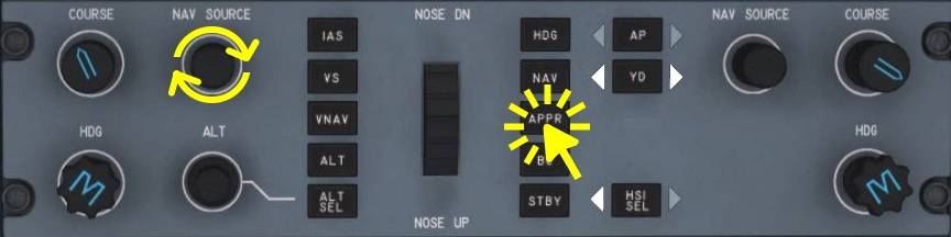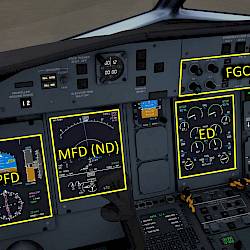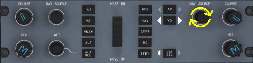 First we will select the FMS1 navigation source on our PFD to have our flight plan available right away. As described in the flight deck introduction these are the required actions on your side to achieve this: