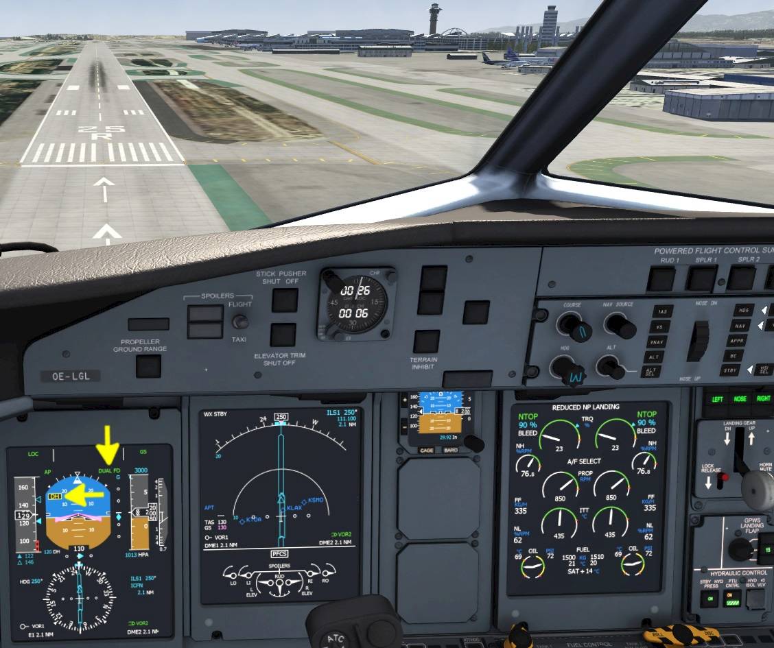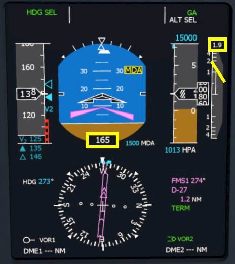 To the right of the attitude you find your typical glide slope diamond, currently indicating that we are slightly below the 3° ILS glide.