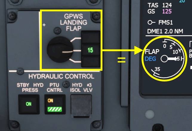 Note - If you want to be even more realistic for this landing and use flaps 10 or want to test out flaps 35 remember to adjust the GPWS LANDING FLAP knob. The Ground Proximity Warning System (GPWS) will otherwise warn you about your flap configuration on short final.
