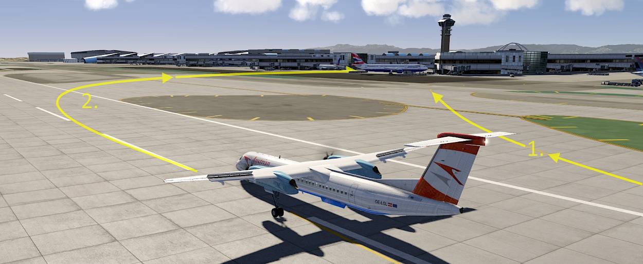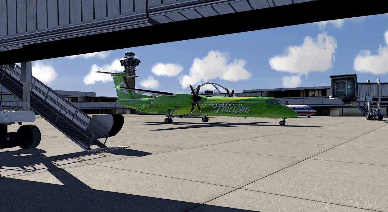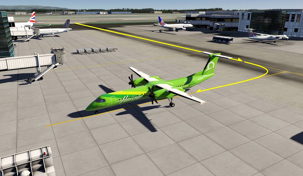 Turn off the taxi lights when you are turning into your parking position. In the real world you would blend ground personnel. If you exited at the same high speed taxi way you can now take any stand (not “gate”) that you like. We would suggest the one opposite of the other Q400 and right next to the parked ATR 42 regional aircraft. This might not be a realistic position for our horizon airline livery but, hey it looks cool, alright?