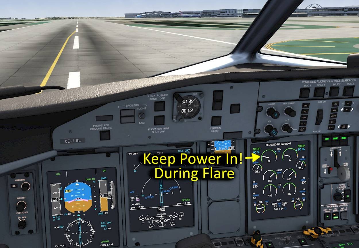 Instead, keep your approach power (roughly 20%) during the entire flare, until the aircraft has settled down.