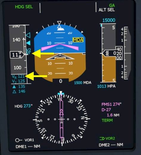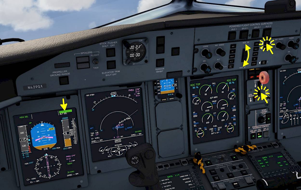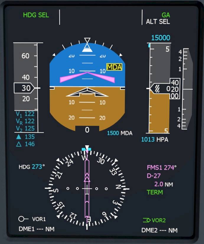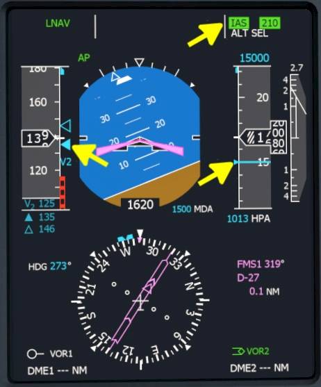 When all these actions for the autopilot have been completed the primary flight display should indicate the modes “HDG SEL” with a selected heading of 273° in this case, GA as active vertical mode and ALT SEL armed with the selected altitude at 15,000ft for this flight.