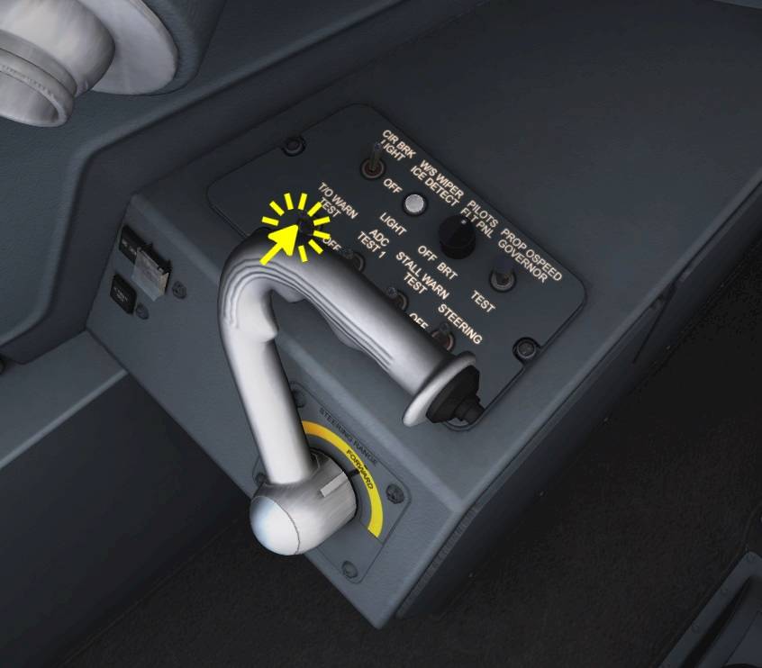 Now, if we didn’t forget anything, the aircraft should be in a condition that we can take off with. To test that we use the takeoff configuration test which is located in front of the tiller and may be hidden by it.