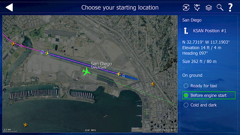 We’re starting this tutorial on the south apron of San Diego with engines off in the “Before engine start” configuration. If you like you can skip ahead and use “Ready for taxi” instead.