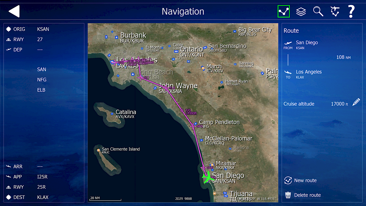 In this tutorial we’re using the Q400 turbo-prop for a short flight from San Diego (KSAN) to Los Angeles (KLAX). We’re taking off from runway 27 towards the Pacific and then turn northbound and cruise along the west coast. During the flight we are going to use the lateral navigation (LNAV) of the flight management system (FMS) and will fly the ILS approach into LAX. The planned route is 103.1 NM long and will take us about 25 minutes. The cruise altitude is going to be 15,000ft and we’re only going to cruise for just a short duration.