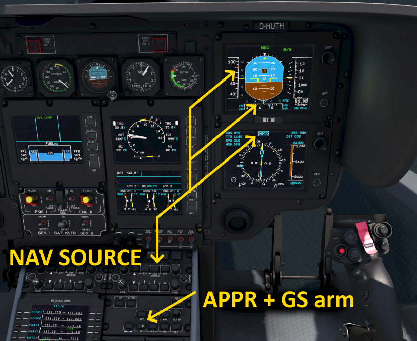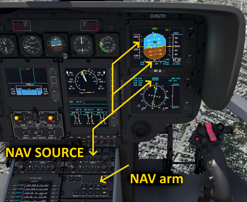 In the EC135 you manually select the navigation source that the autopilot follows. The selection can be changed in the control panel just above the autopilot panel.