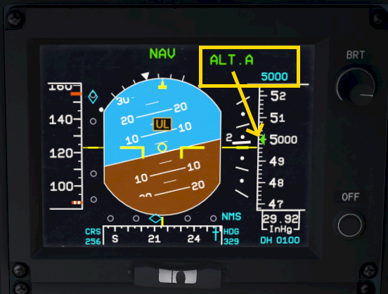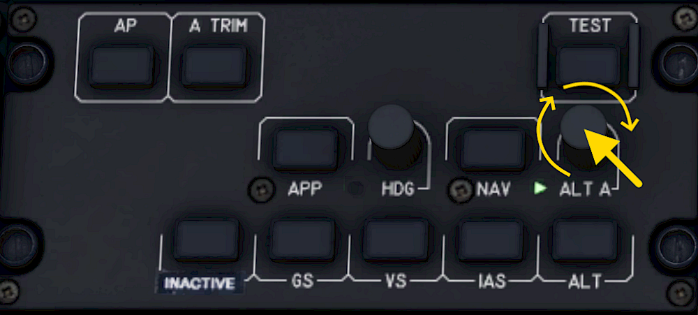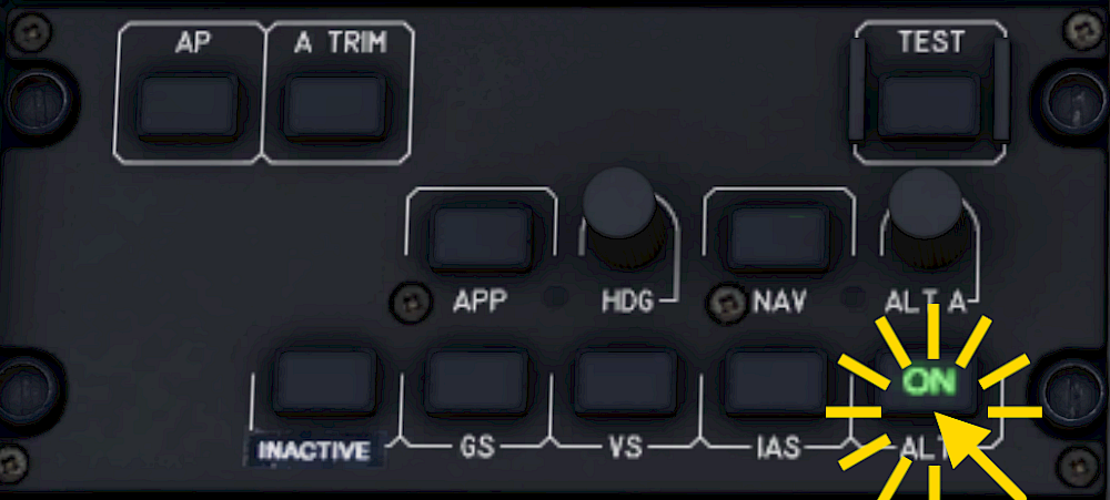 The green indicator next to the ALT A knob turns on and the FMA shows “ALT.A” and the selected altitude in cyan underneath.