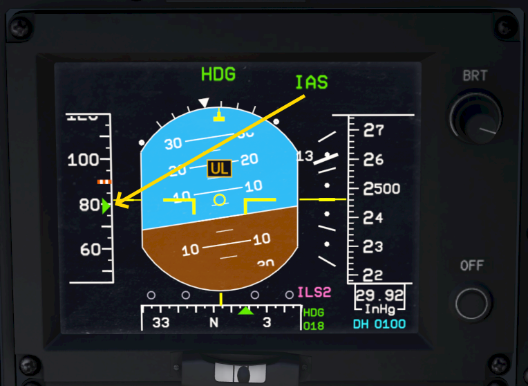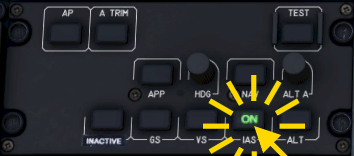 The FMA shows a green “IAS” when the mode is engaged and the IAS button on the autopilot panel lights up in green. The PFD shows a green triangle at the selected airspeed.