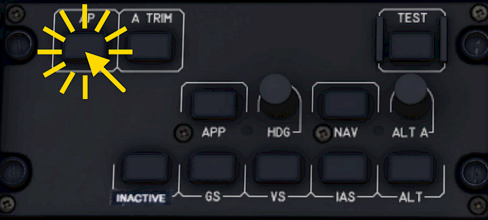 During a normal flight the autopilot is engaged before takeoff and remains on. After turning it on the autopilot maintains the pitch and bank attitude. The autopilot is engaged or disengaged with the AP push-button on the upper left corner of the autopilot panel. The AP button shows an amber OFF light when ever the autopilot is off.